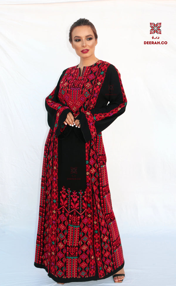 Hand-embroidered to perfection. Our best selling black traditional Palestinian thobe