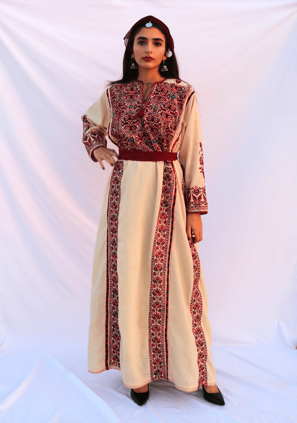 Heba - Hand Embroidered Beige Palestinian Dress Thobe