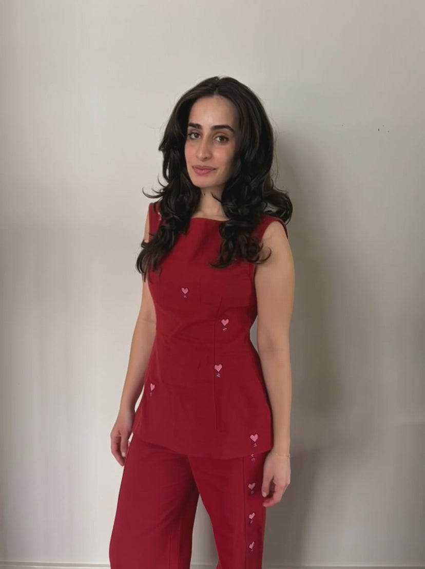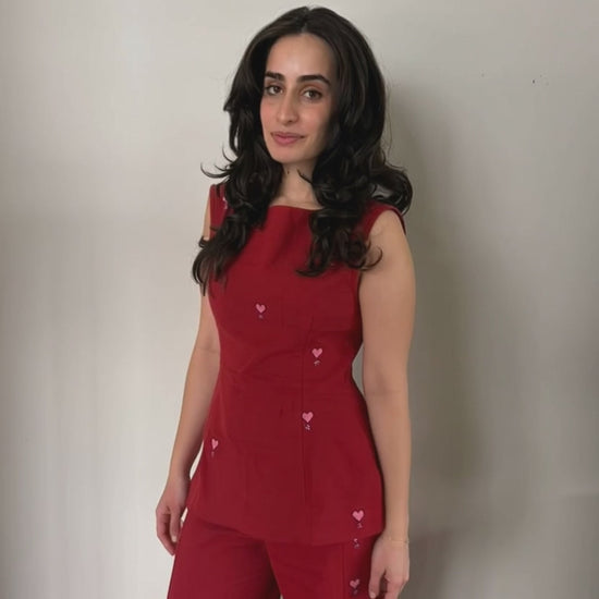 A make to order item - Hand embroidered Linen shirt with hand beading - - Shirt is fitted at the breast and zips from the back - Pants are a loose fit - Hand embroidered and hand beaded - Loose fit & elastic band waist - We ensure fair pay and full support to all artisans involved in the making of this product